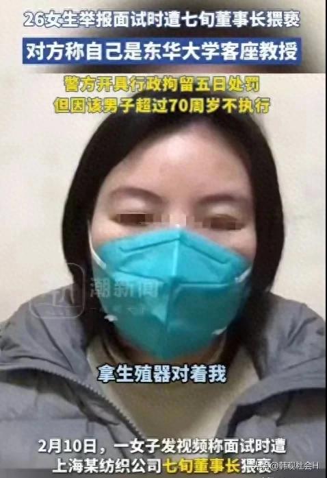 据深圳广播电视台第一现场报道,一张姓女子在网上实名举报自己在上海某纺织公司面试的时候,遭到了这家公司7旬董事长的猥亵。据张女士讲述,自己当时在网上看到这家纺织公司招聘康复理疗师,主要是为7旬董事长服务,工资待遇都很不错,张女士就很是心动,在网上就投了简历。
