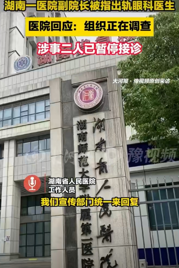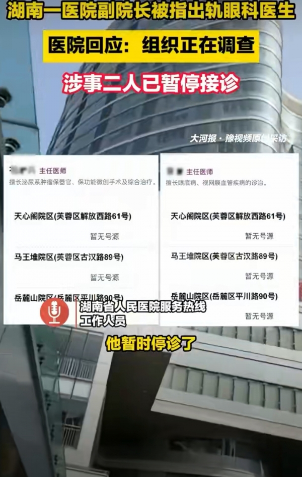 一则关于湖南省人民医院副院长与眼科主任的"不雅视频"在网络疯传,引爆舆论。事件曝光后,记者调查发现,两位涉事医生的挂号页面均显示"暂无号源",已处于停诊状态。院方最新回应称:组织正在调查。