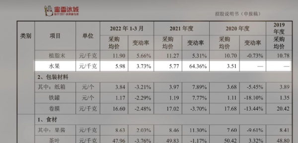 2019至2022年第一季度的水果采购数据显示,单价随市场供需呈周期性波动,2021年水果采购单价达5.77元/千克,直接推高当期成本。