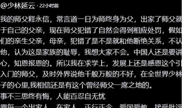 可就在其刚上任不到24小时,就有释永信弟子"释延云"跳出来发表百字言论,字里行间皆是对释永信的感激之情。