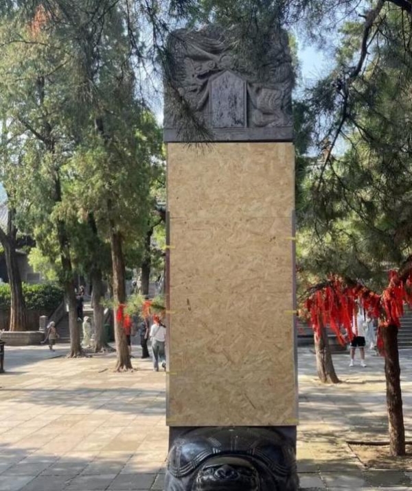 在其没出事前,石碑上刻录着有关释永信密密麻麻的"丰功伟绩",一夜之间被曝塌房后,石碑也被火速盖上了木板,从上到下被遮挡的严严实实的。