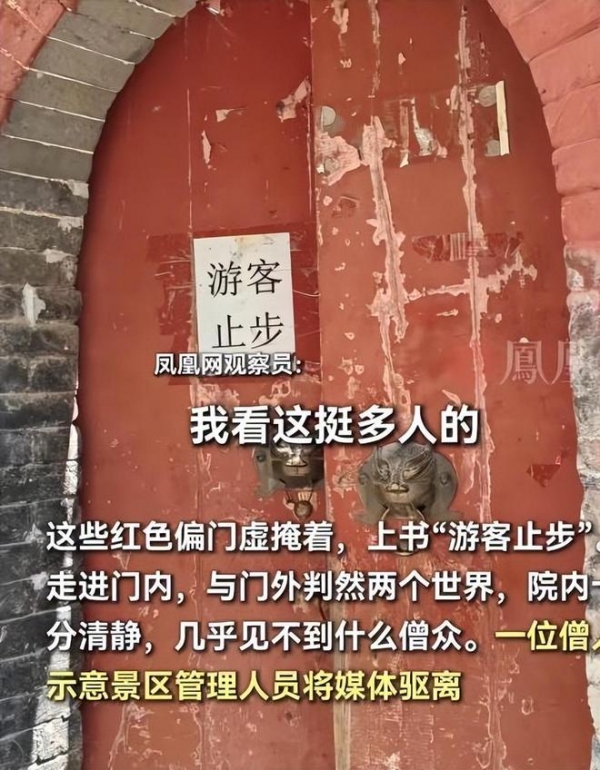 坐落在寺院内的一处红色偏门,以往是可以自由进出的,如今却被贴上了"游客止步"的温馨提醒。