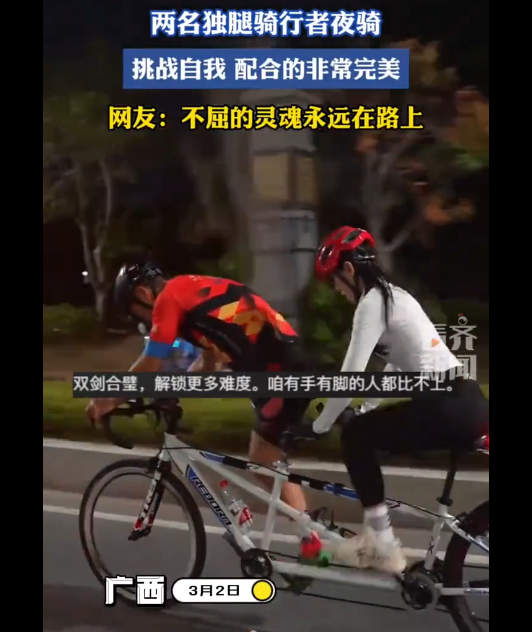 前残奥健将归玉娜与一条腿搭档的骑行默契,核心在于"我用左腿,你用右腿,我们合起来就是一双完整的腿"。这种配合将两人各自的单腿力量凝聚成协同动力,用最朴素的方式诠释了功能互补的智慧。