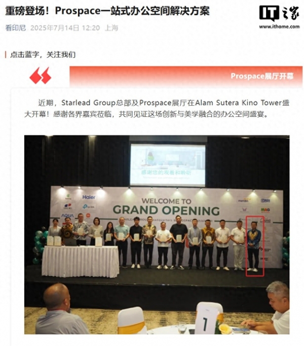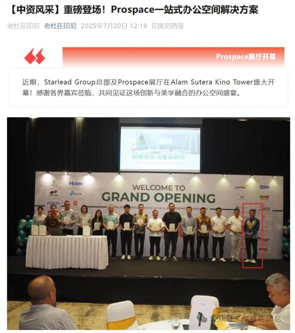多个印尼相关账号曾在 2025 年 7 月发文,Starlead Group 总部及 Prospace 展厅在 Alam Sutera Kino Tower 开幕,照片最右侧穿蓝色花衣服的疑似为刘立荣。