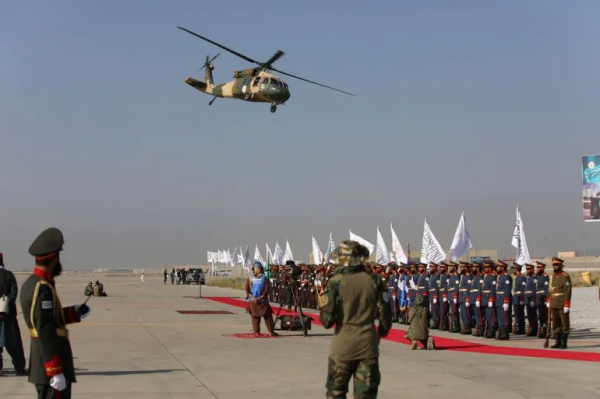 2024年8月14日,在阿富汗帕尔旺省巴格拉姆空军基地举行的纪念联军撤出阿富汗三周年的阅兵式上,一架UH-60"黑鹰"直升机在飞行