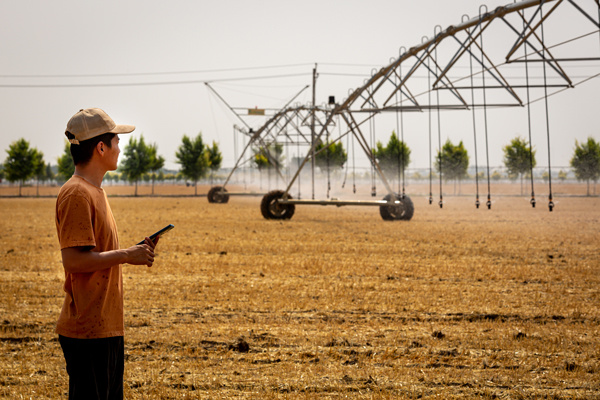 2024年6月14日,河南省安阳市,人们可以使用手机APP操控大型喷灌机为大豆玉米间作农田灌溉。 IC photo