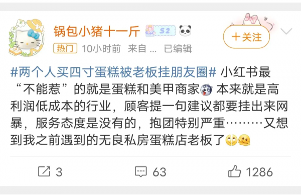 咱就是说咱作为一个老板,给顾客提供商品是您的天职吧。不愿意做不卖不就得了,卖都卖了,两情相悦的事儿有必要再发朋友圈吐槽吗?看不起谁呢,你不就是一个卖蛋糕的吗?