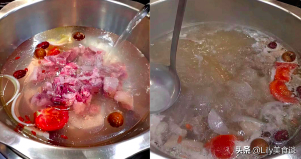 2、鲜羊肉汤,新鲜的羊肉直接下锅,加入清汤羊肉用的配料红枣、生姜、桂圆(煲羊汤用的料)番茄,倒入适量的纯净水。