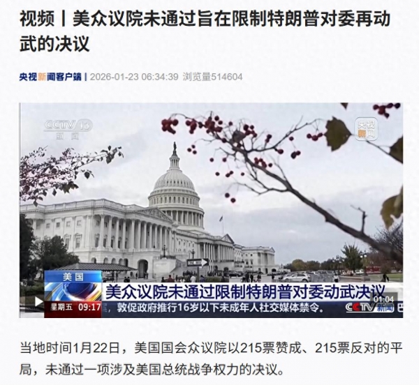 据央视新闻报道,当地时间1月22日,美国国会众议院以215票赞成、215票反对的平局,未通过一项涉及美国总统战争权力的决议。