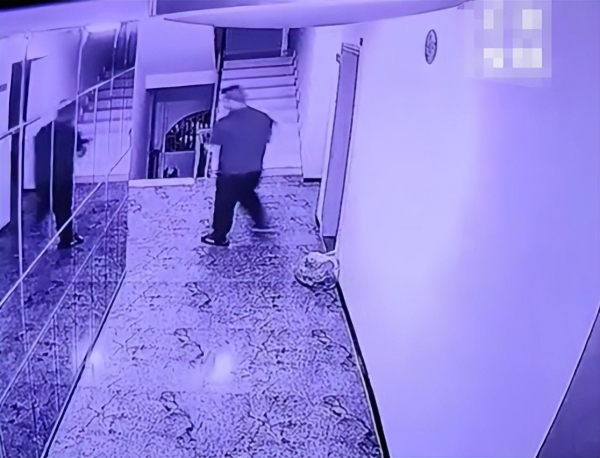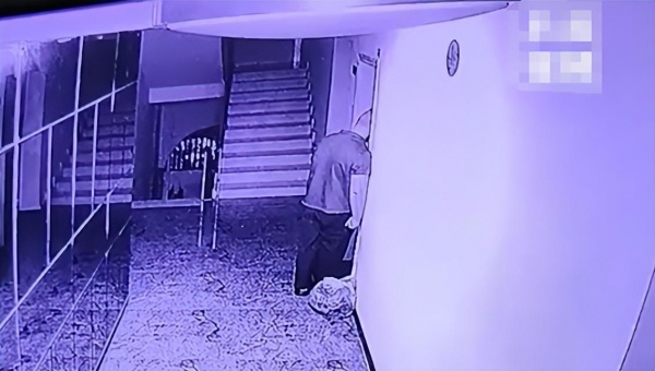 监控视频显示,凌晨三点多,一男子在楼道里鬼鬼祟祟趴门上偷听,没想到门突然开了,男子吓了一跳,和开门丢垃圾的女住户对视一眼后,淡定转身离开,装作玩手机的样子朝楼下走去。
