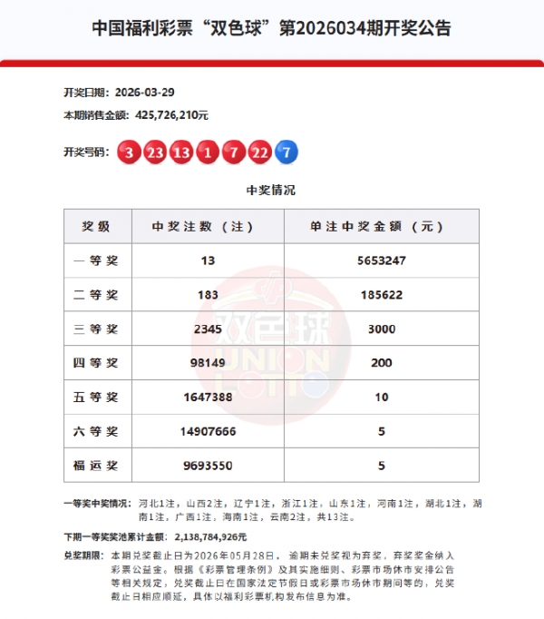 北京时间2026年3月29日,福彩双色球第26034期开奖,当期开奖号码为红球01 03 07 13 22 23,蓝球07。本期一等奖开出13注,单注奖金565万余元;二等奖开183注,单注奖金18万余元。此外,因开奖前奖池高于15亿,增设5元福运奖(命中3枚红球即中奖),共开出9693550注。本期双色球销量为4.25亿余元,奖池余额21.38亿余元。