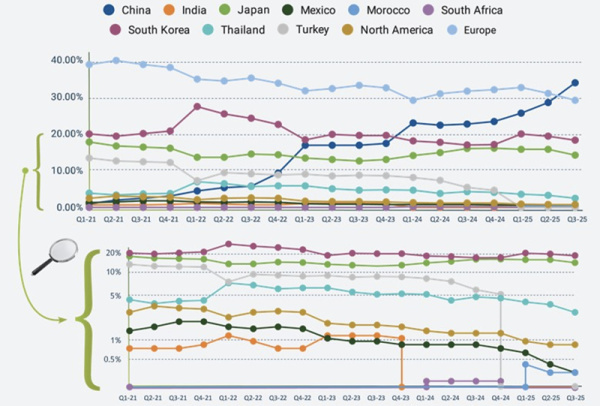 以色列进口汽车协会11月发布的数据显示,今年第三季度,中国产新乘用车注册量占比达34.1%,较第二季度的28.7%和去年同期的22.8%持续攀升。尤其在电动汽车领域,中国产车型占据主导地位。