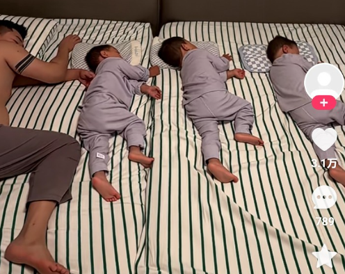 原来在一个周末的晚上,一家五口人吃完饭了,大家都还做了一个互动游戏,完了之后,可能是小孩子也感觉累了,想睡着了,于是爸爸就先带着三胞胎儿子上床睡觉,一会儿之后,等到妈妈冲完凉出来的时候,看见了他们爷子四个人的睡姿竟然是那么协调统一,于是妈妈赶紧从裤兜里掏出手机,把眼前这个美妙的画面记录下来了。