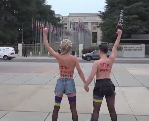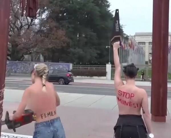 近日,在瑞士日内瓦的万国宫前,发生了一起引人注目的抗议事件。两名来自乌克兰的女子,赤裸上身试图破坏一件名为"断椅"的反对地雷雕塑,这一行为迅速引起了现场人群的围观和警方的注意。随后,这两名女子被当地警方逮捕。
