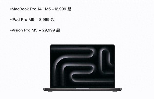 MacBook Pro 14 寸 M5 芯片起价 12,999 元,iPad Pro M5 起价 8,999 元,Vision Pro M5 甚至直接飙到 29,999 元。