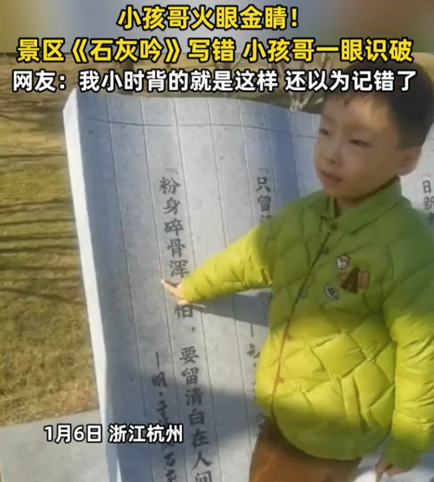 这下解释不清了!浙江杭州,男子带孩子去逛景区,路过一处石碑上面写着《石灰吟》,男孩当场表示写错了,爸爸问哪里写错了,孩子表示其中应该是"粉骨碎身",可上面写的却是"粉身碎骨"。网友:我怎么记得跟我小时候学的不一样。