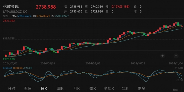 黄金盘初下跌,目前在2740关口小幅震荡。