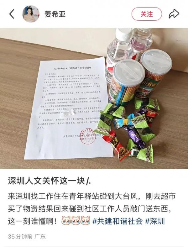 9月23日中午,来深求职的网友在社交媒体发布的帖文,展现了防御台风之际深圳的"暖"。这位网友的发文称,来深求职碰上台风,住在青年驿站的她碰到社区人员敲门送物资。