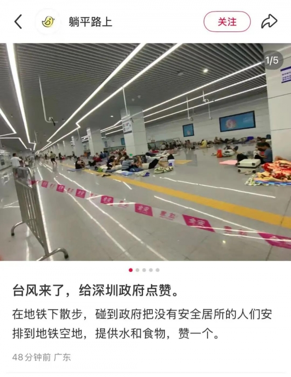 在深圳,全面而细致的防台风应急措施,让网友觉得"心里暖暖的"。有市民在社交媒体发帖称,"台风来了,给深圳政府点赞"。网友说在地铁站看到站内已经围出一片区域,为群众提供紧急避难场所。