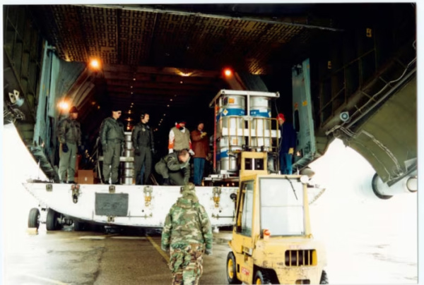 资料图:1994年,一个装有铀的桶被装载上一架美国运输机。 美国国家安全档案馆