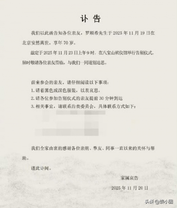 讣告里写得清楚,罗晋父亲罗顺希11月19日在北京走了,享年70岁,23号要办告别仪式,盼着亲朋好友到场送最后一程。