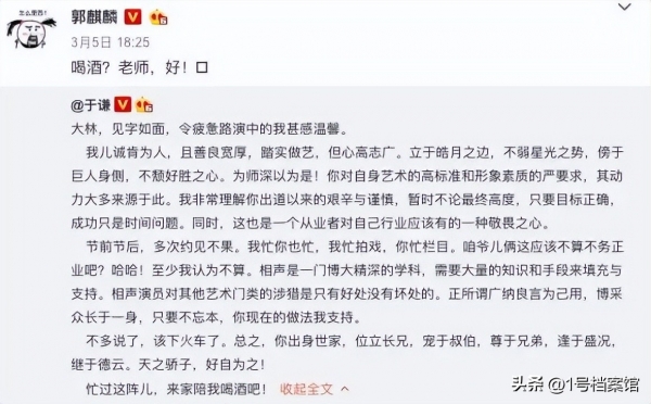 在某次的综艺上,节目组要求他给父亲写信,大概没有人想到这封信他写给了自己的师傅于谦,