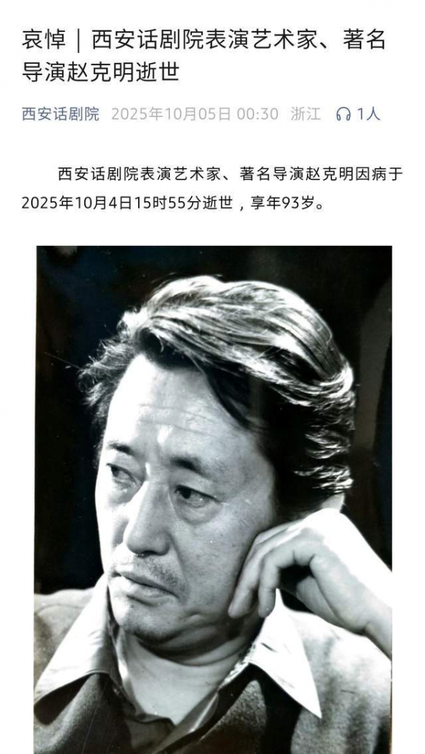 西安话剧院表演艺术家、著名导演赵克明因病于2025年10月4日15时55分逝世,享年93岁。