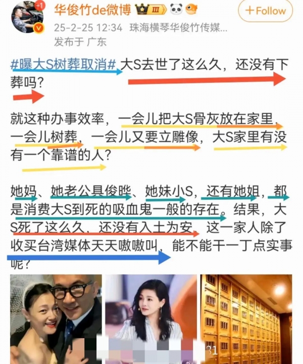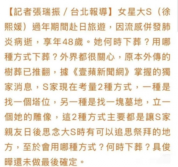 如今,大 S 的骨灰已存放近一个月,依然暂存在殡仪馆,安葬方案仍悬而未决。