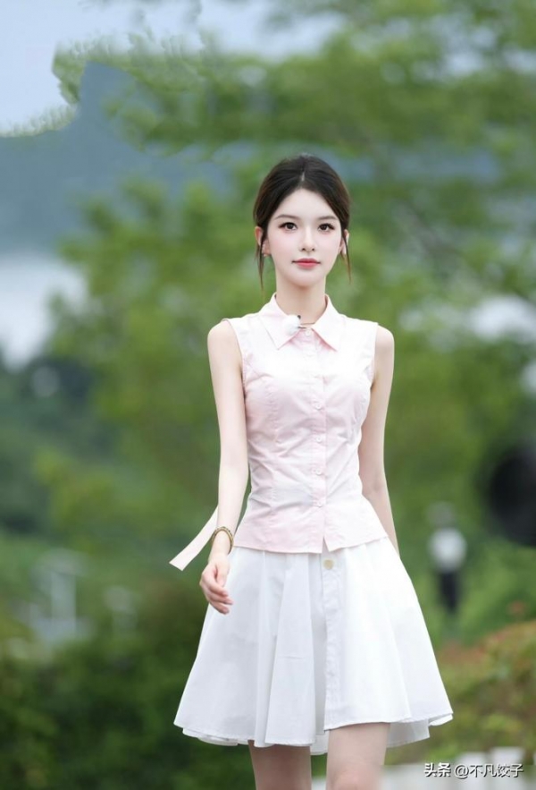 还有那套粉色无袖衬衫+白色半身短裙,颜色清新得像夏天的柠檬汽水。粉色选浅粉不选荧光粉,衬衫无袖但有小开衩,胳膊粗的姐妹也能穿。配白色短裙显腿长,再背个草编包,去喝下午茶或逛公园,回头率绝对高!