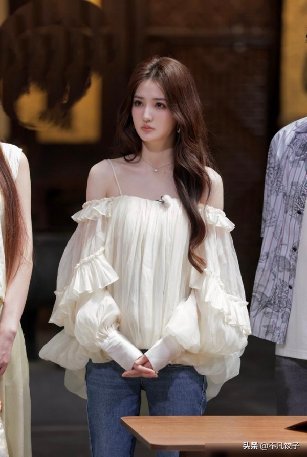 还有那件白色一字肩雪纺上衣,袖口层层叠叠的荷叶边柔纱,穿上像花苞刚要绽放,配条直筒牛仔裤瞬间中和了甜美感。一字肩最容易显肩宽,但徐璐选的是微收的剪裁,露出锁骨又不暴露缺点,普通人日常穿可以配个小开衫,上班约会都能搭。