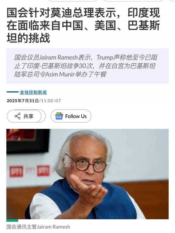 比如议员拉米什就指责莫迪外交政策失败,印度现在必须应对中国、美国和巴基斯坦带来的共同挑战。