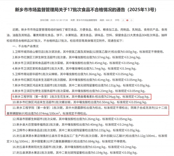 "第一食堂被市场监督管理局通报两次,我们担心影响孩子的身体健康。"近日,大象新闻接到新乡工程学院家长求助,根据新乡市市场监督管理局在2025年12月30日发布17批次食品不合格情况的通告,新乡工程学院(第一食堂)涉及2个批次、3项内容。