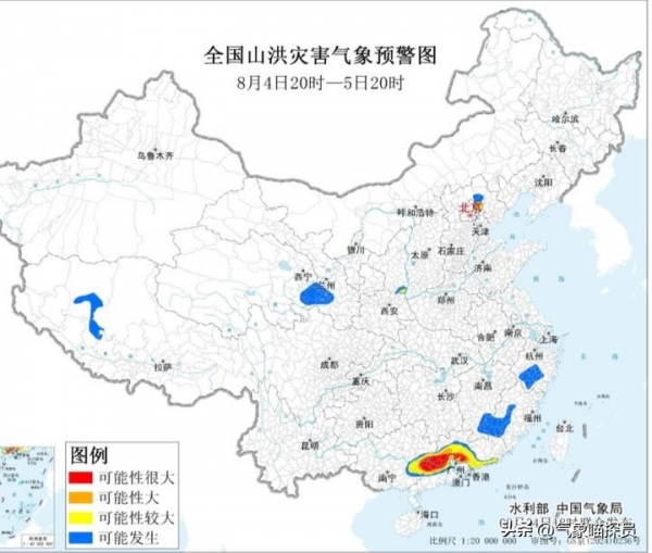 水利部和中国气象局继续发布山洪灾害红色预警。受到持续性的强降雨影响,在24小时内北京、甘肃、新疆西部、浙江中部、福建南部等地均有可能发生山洪灾害;广西东部以及广东一带发生山洪灾害的可能性较高;广东中南部一带发生山洪灾害的风险高,个别地区很高,具体分布可见下图。