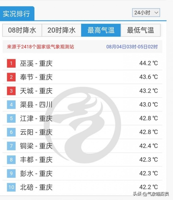 昨日全国高温榜里全都是四川和重庆的城市,所有上榜的城市最高气温均突破了42℃,其中重庆巫溪一带达到了44.2℃,成为了昨日全国最热的地方。重庆奉节、天城以及四川渠县一带稍微凉快一点,但也有43℃以上。那为什么会这么热呢?主要还是因为大陆高压与副热带高压打通的,这些地区的下沉气流大幅度增强,从而出现了大范围高温甚至是极端高温。