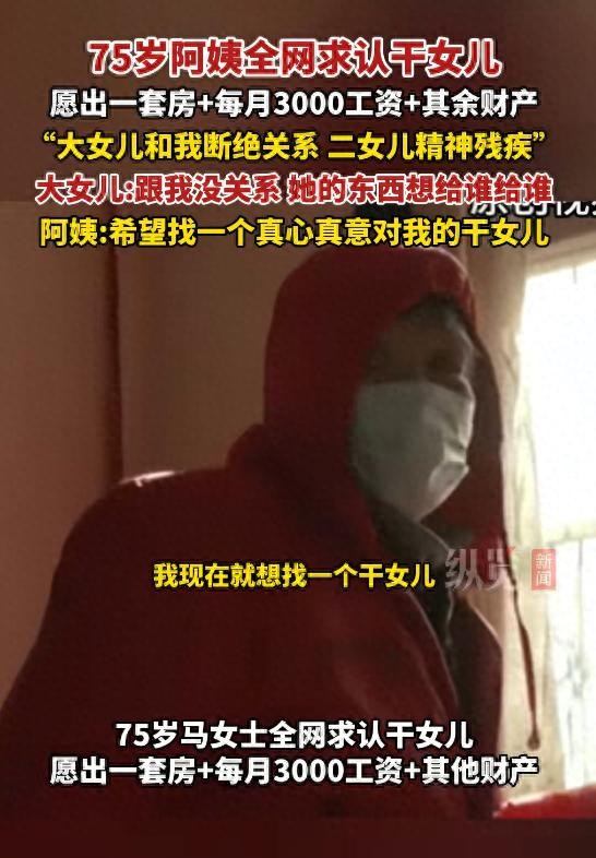 阿姨姓马,说她早年离异,老家亲戚都不联系了。和大女儿闹翻是因为带外孙女的问题,后来俩人彻底断绝关系。二女儿有精神残疾,没法照顾她。现在她自己住,感觉孤单,就想找个真心的人养老。大女儿回应时冷冰冰地说"跟我没关系"。