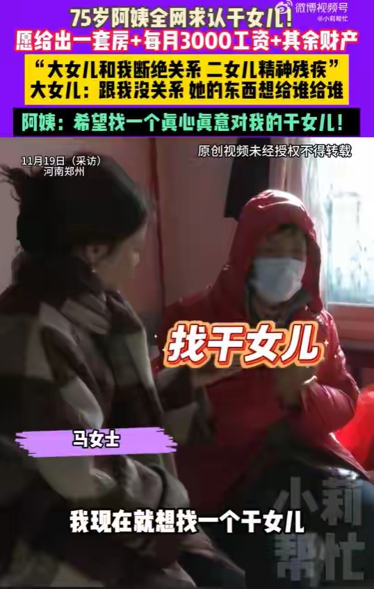 11月19号,郑州街头突然出现很多寻人广告,上面写个阿姨要找干女儿。这阿姨75岁,说要是有人愿意当她干女儿,就给一套房子,每月3000块钱,还有其他所有财产。事情传得很快,网上议论纷纷。