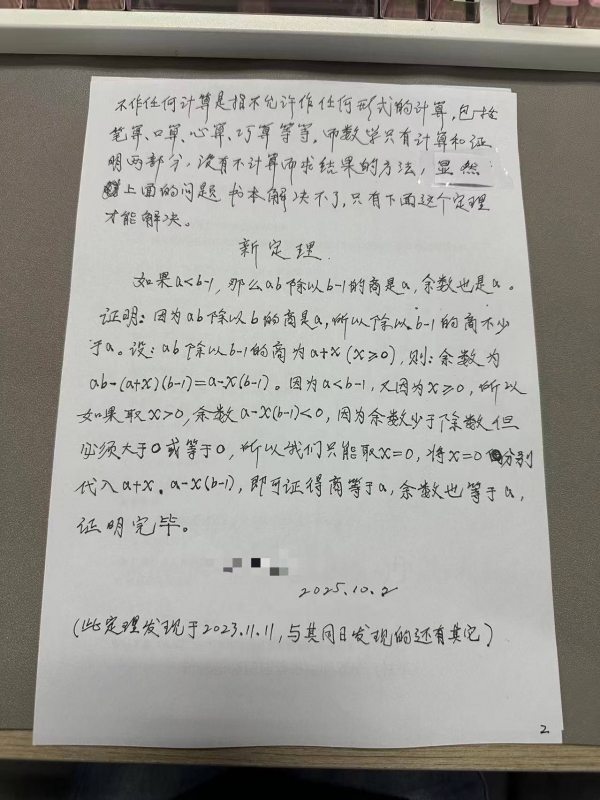 张女士:大概今年9月初。有天晚上他突然说,有事想请我帮忙。我们就在公司聊了两个多小时。一开始聊他的家庭情况、对数学的热爱等。聊着聊着,他递给我一个绿色的盒子。上面缠满了胶带,一打开是加起来有八九厘米厚的演算纸。他在别人用剩的这些纸的背面,写了好多他研究的定理和公式。一些纸张已经泛黄,感觉一碰就要碎了。