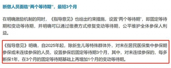近日,《关于健全基本医疗保险参保长效机制的指导意见》发布,对断缴人员和未按时参保人员设定待遇等待期。一旦你断缴了,3个月不能享受医保报销。每断缴一年,再增加1个月。