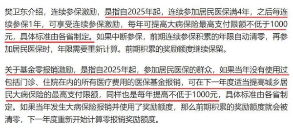 在这次发布的文件中,还有两个新规,我觉得也是没搞清楚居民弃保的真实原因。为了鼓励居民参保,推出了两个激励措施。第一个是从2025年起,连续参加居民医保满4年,之后每连续参保1年,可享受连续参保激励,每年可提高大病保险最高支付限额不低于1000元。第二个是从2025年起,如果当年没有报销过,那下一年度适当提高城乡居民大病保险的最高支付限额,同样也是每年提高不低于1000元。