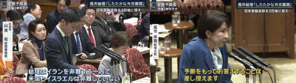 面对高市的敷衍,山添拓并未作罢,在对方离开讲台后继续追问道,既然高市提起即将举行的美日首脑会谈,她是否会借机"要求美方停止攻击"。