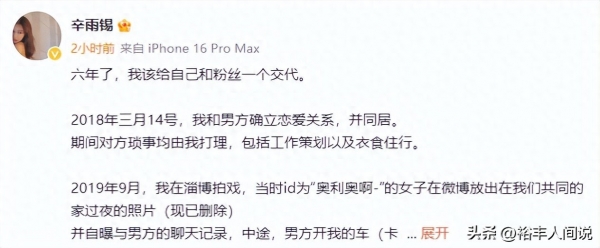 从辛雨锡曝料的长文中不难发现,她与秦霄贤已经相识相恋6年的时间(而且网传两人恋情由来已久,但都被否定)。具体的日期可以追溯到18年的3月份,确定恋爱关系后,便迅速展开同居,这期间男方的一些琐事全部由她打理,包括衣食住行以及工作策划等等。