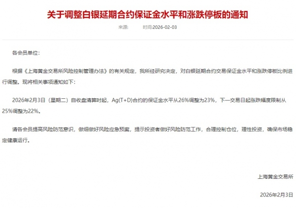 2月3日,上海黄金交易所发布《关于调整黄金部分合约保证金水平和涨跌停板的通知》《关于调整白银延期合约保证金水平和涨跌停板的通知》。