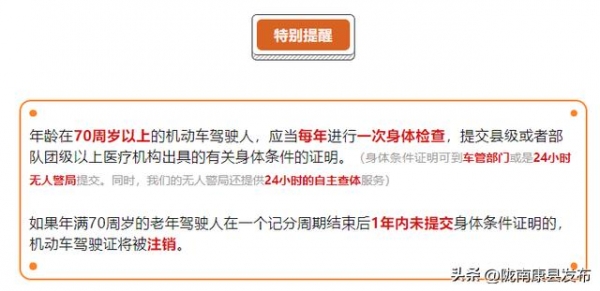 如果年龄在70周岁以上的驾驶人,需要提交县级或者部队团级以上医疗机构出具的有关身体条件的证明,如果未在一个记分周期结束后1年内未提交身体条件证明的,机动车驾驶证将被注销,根据规定,注销的驾照是无法换证的。