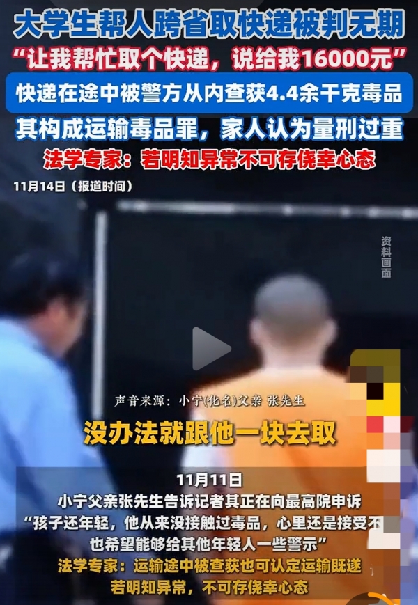 最近,一则关于21岁大学生帮人跨省取快递却被判无期的新闻引起了广泛关注。事情是这样的:这名学生被人以16000元的报酬诱惑,去跨省取一个快递,结果快递里竟藏有4.4余千克毒品,他也因此触犯了运输毒品罪。原本充满希望的青春年华,却因为一念之差深陷囹圄,实在让人唏嘘不已。