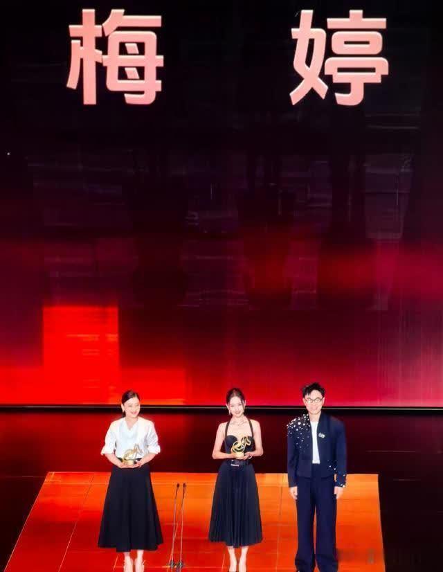 她和雷佳音、朱一龙三人同时拿下抖音电影奇遇之夜年度电影人的奖项,三人上台接受表彰。