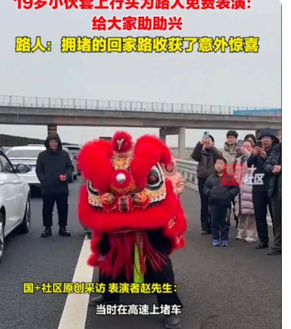 1月24日,江苏宿迁高速公路上车辆拥堵,停滞不前。在这漫长的等待中,一位19岁的小伙决定为路人们带来一丝欢乐。他换上精心准备的行头,毅然走上拥堵的路段,开始为被堵车流困住的路人们免费表演。