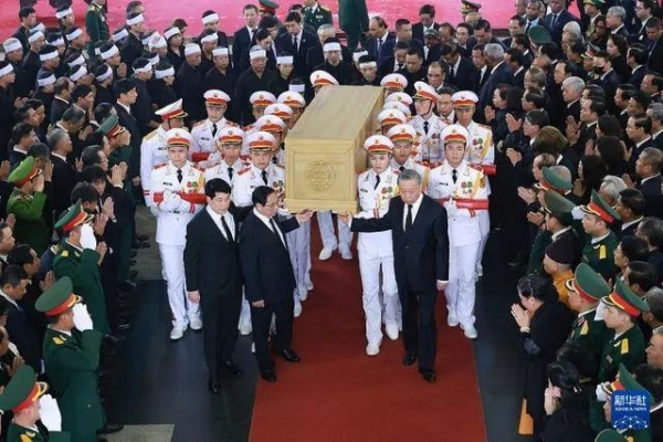 7月26日,在越南河内国家殡仪馆,人们将阮富仲的灵柩抬向灵车 图:新华社/越通社