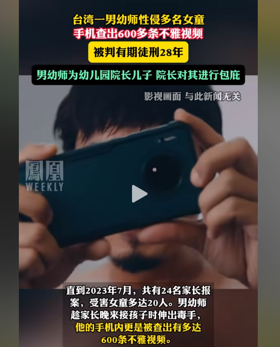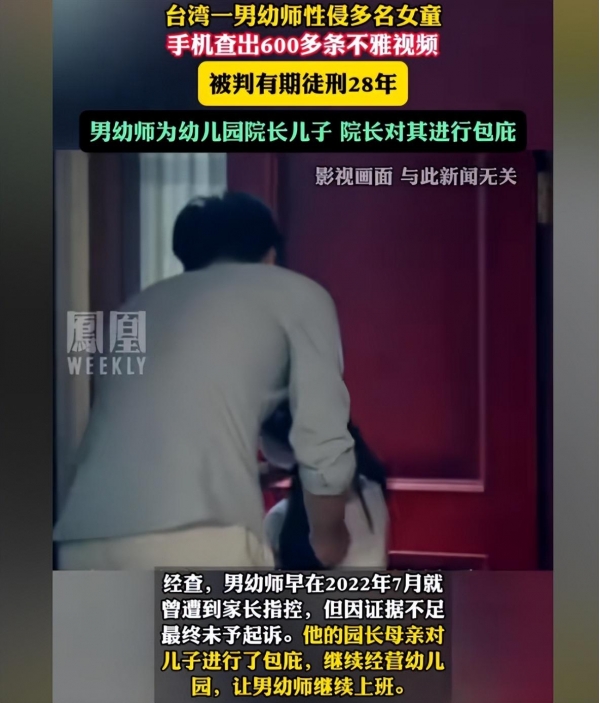 台北一家幼儿园的男幼师,利用职务之便,性侵了20多名女童,最小的2岁,还拍摄了600多部猥亵视频。