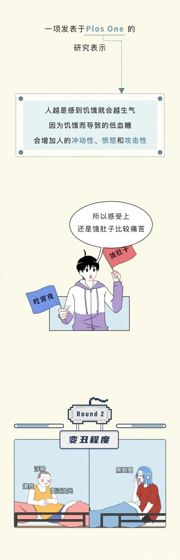 其实熬夜吃宵夜和饿肚子的行为都比不上熬夜本身来得危害大,熬夜对人体的伤害是不可逆的,也正是在熬夜的作用下,宵夜和饿肚子才有这么多隐患。