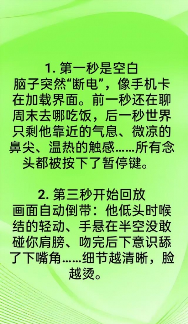 9. **回忆反复播放** 女性常常会在脑海中反复回味那个吻的细节,嘴唇的触感、对方的气息,这种回忆强化了情感记忆。